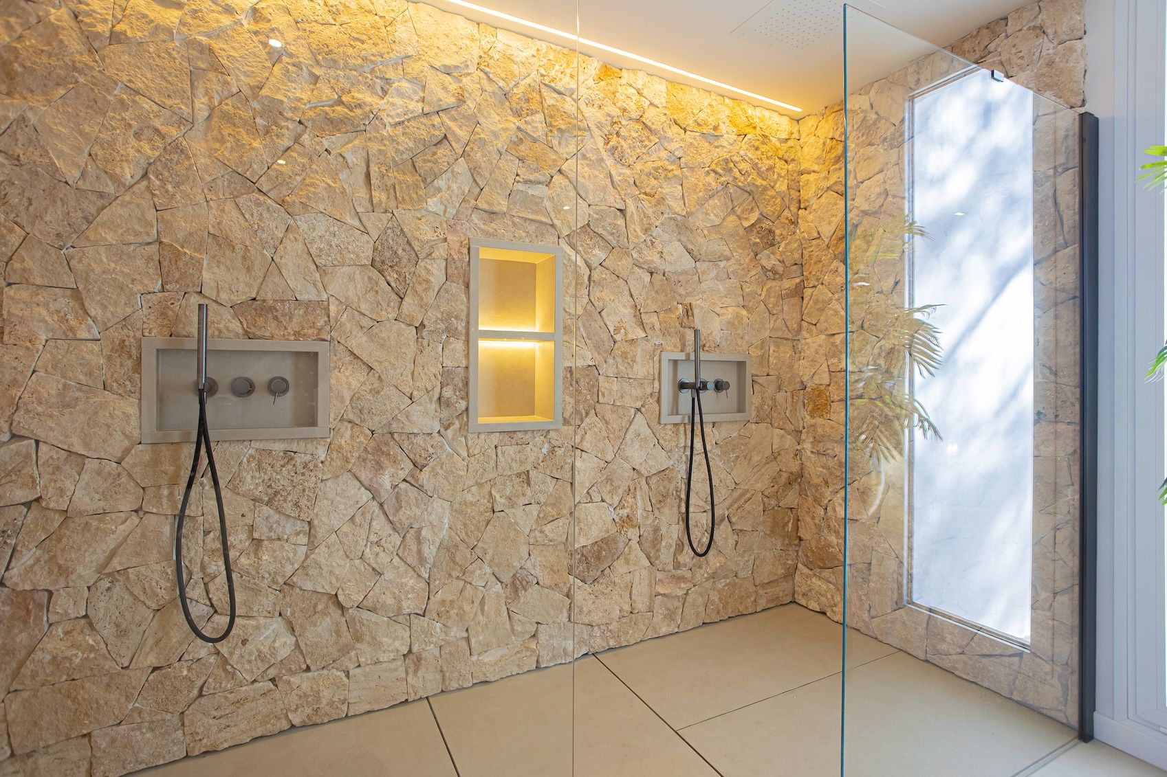 The villa features four spacious double bedrooms, including two with en-suite bathrooms, one shared family