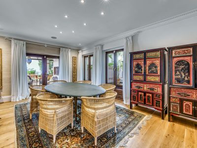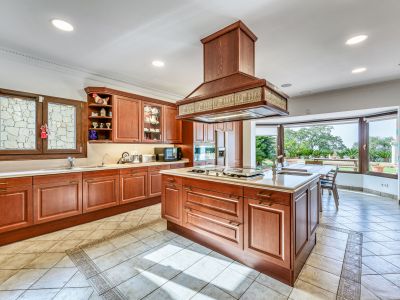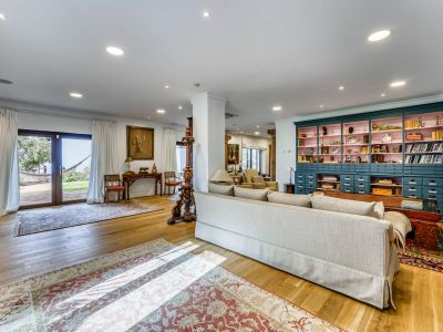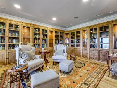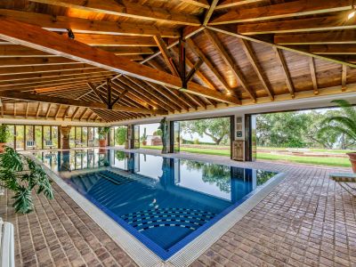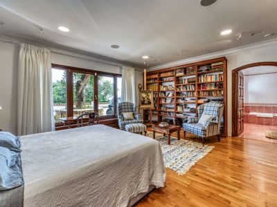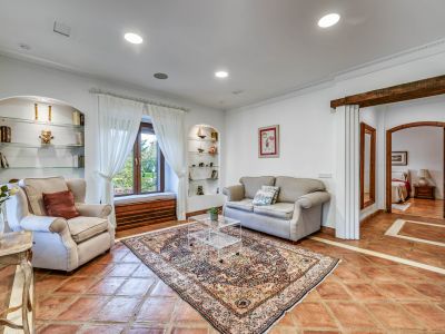 The main residence spans two levels, featuring a thoughtfully designed layout and an elevator. The ground floor encompasses: spacious living area with adjacent library; fully-equipped kitchen; dining room; welcoming lounge with a fireplace; three luxurious bedroom suites, two of which include living rooms. These areas seamlessly connect through an elegant hallway graced with vaulted ceilings. Additionally, this level houses a gym area with jacuzzi, two guest toilets, laundry area and storage facilities. Separated form the main building, is a covered swimming pool with a dressing room and a toilet; garage for 6 cars, as well as a fully-equipped service apartment. The ground level provides access to a variety of spacious terraces, porches, and inviting patios, offering an exceptional outdoor living experience.