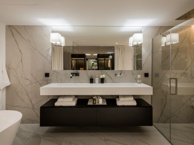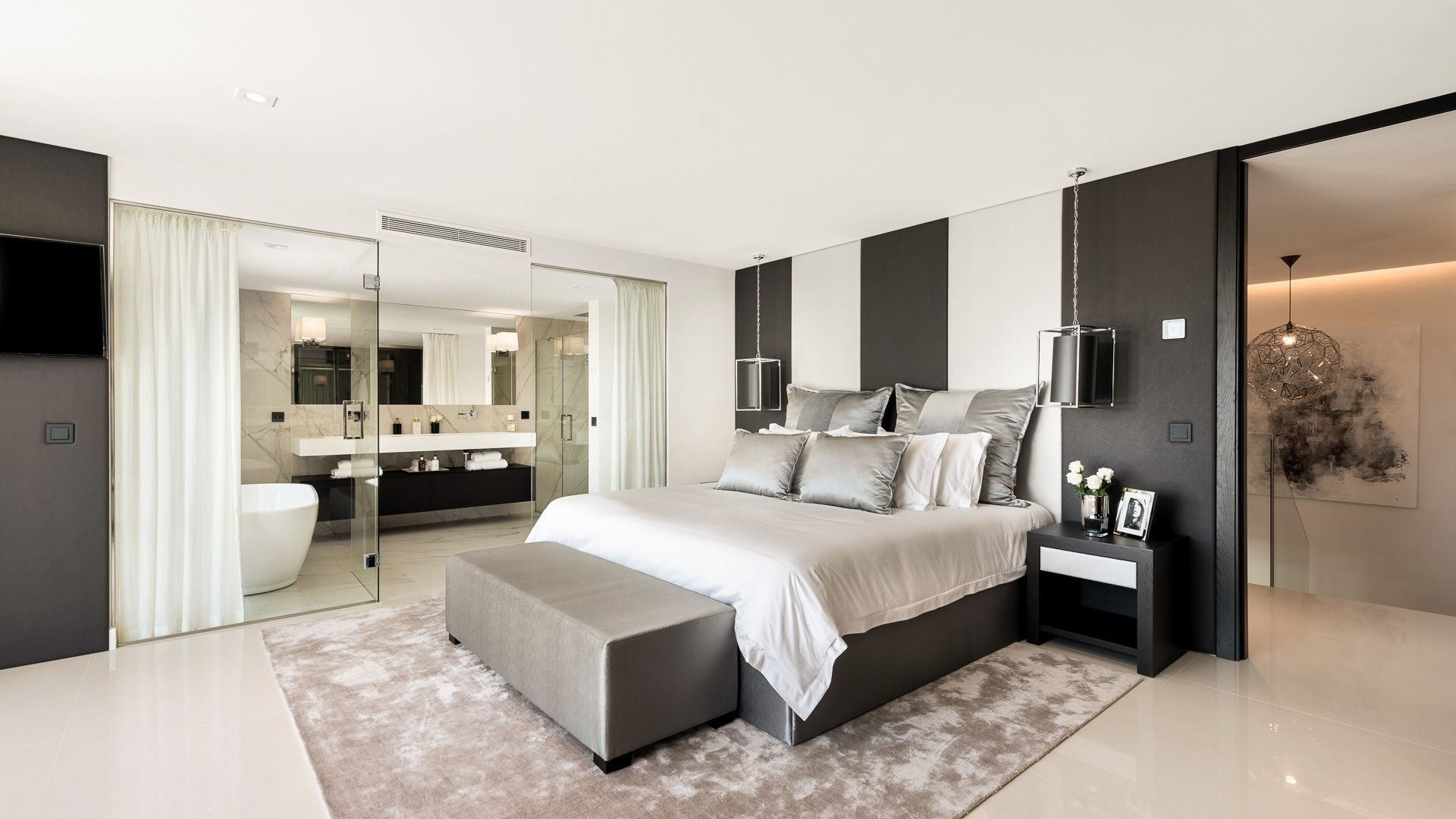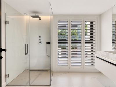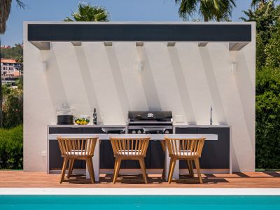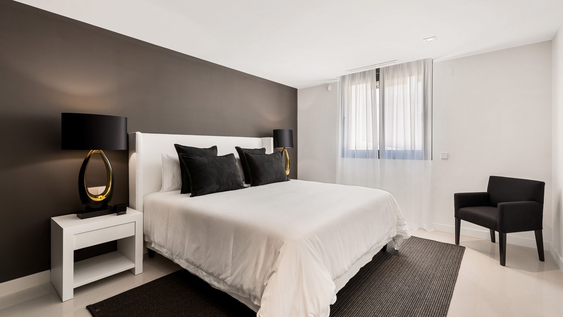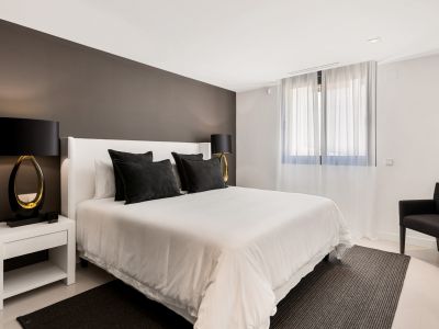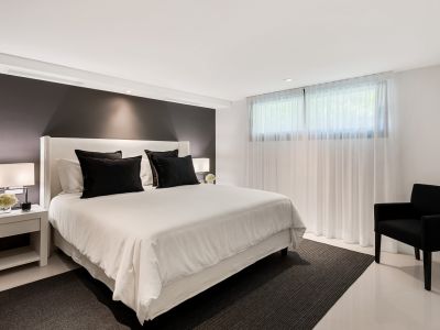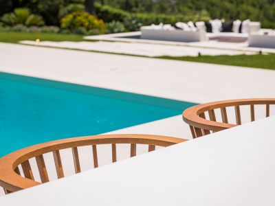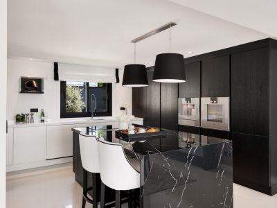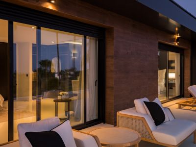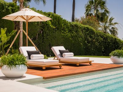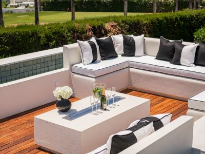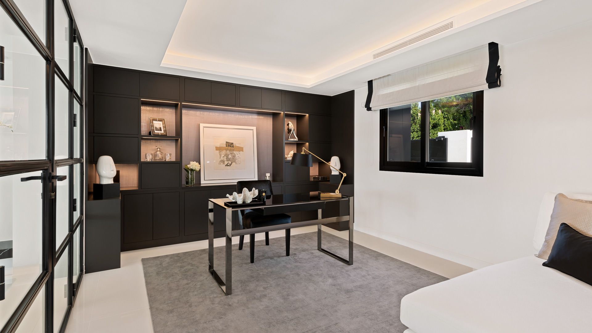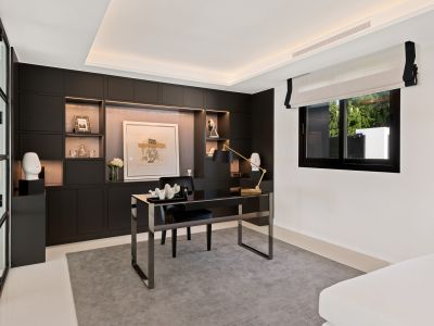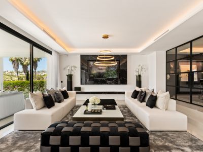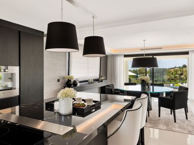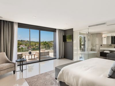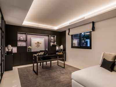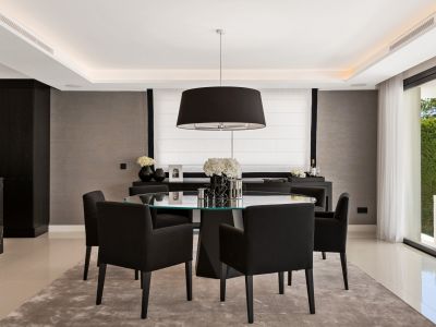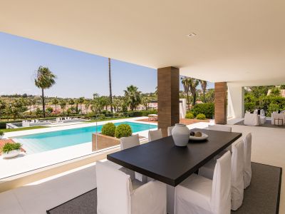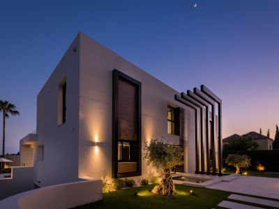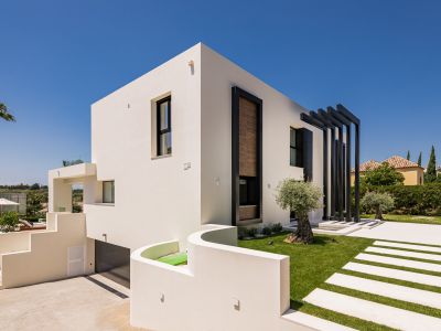 Spectacular villa designed by a well-known award-winning architect located in a privileged setting in the heart of the Golf Valley of Nueva Andalucía, one of the most sought-after residential areas on the Costa del Sol. This southwest-facing villa is distributed over three floors and comprises, on the entrance level: bright hall leading to a huge open-plan living area divided into three seating areas, Italian designer kitchen fully equipped with Gaggenau appliances and dining area. All leads to a spacious porch, the beautiful landscaped gardens with a stunning chill out zone with water features, the extra sized heated pool with outside shower and plenty of space to sunbath and the outside BBQ kitchen – all with stunning views over the the golf course. Upstairs: master bedroom with a huge elegant wardrobe, en-suite bathroom and access to the terrace to enjoy the views, even from the bathtub; further suite; 2 bedrooms sharing a bathroom. All bedrooms have spacious built-in oak wardrobes. Lower level: 2 more bedrooms; laundry room; wine cellar; gym and a home-cinema. Built to the highest specifications and finishes, including bathrooms with Dornbracht fittings to mention a few. Quietly located, undisturbed, on an elevated plot on the golf course. Situated only a few minutes’ drive to the renowned Aloha international college and Aloha, with its rich selection of restaurants, bars and amenities. Only 5 minutes’ drive to Aloha Golf, Las Brisas Golf, La Quinta Golf, Magna Marbella Golf, and a wide selection of tennis and paddle tennis courts. Only 10 minutes’ drive to Puerto Banús, the beach and Marbella’s Golden Mile.