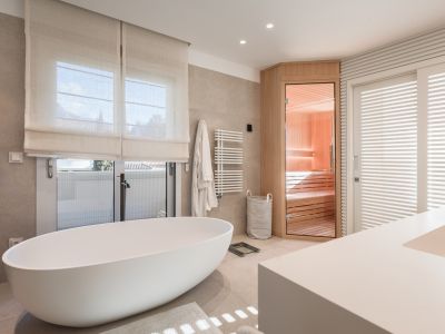 The property features a master suite complete with a dressing room, en-suite bathroom, and sauna, along with two additional bedrooms—one of which is en-suite. Additional amenities include a spacious lounge and dining area, a guest cloakroom, several large terraces, a fully equipped modern kitchen, private elevator access, underfloor heating throughout, mosquito nets in all doors, Gira domotic system, electric courtains and underground parking for two vehicles, all integrated with advanced domotic systems. The complex boasts a heated pool and 24/7 guards.