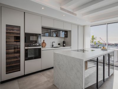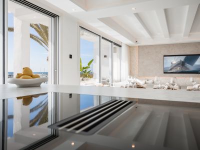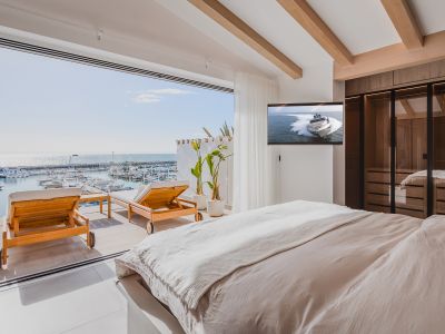 A bright and spacious duplex penthouse on the front line in Puerto Banús designed and decorated by one of Marbella’s leading architects. The property consists of large and bright living room with cream marble floors and feature lighting, a very spacious master en-suite bedroom with walk-in wardrobe and stunning sea views. There are two further en-suite double bedrooms, plus a further guest bedroom with separate bathroom; a fully fitted kitchen with high quality appliances and plenty of cupboards and storage space. The property also features an amazing terrace with stunning views over the boats and sea. The property is fully furnished. It has just been fully renovated and redesigned to top quality specifications. Included in the price there´s a 10 year free port pass.