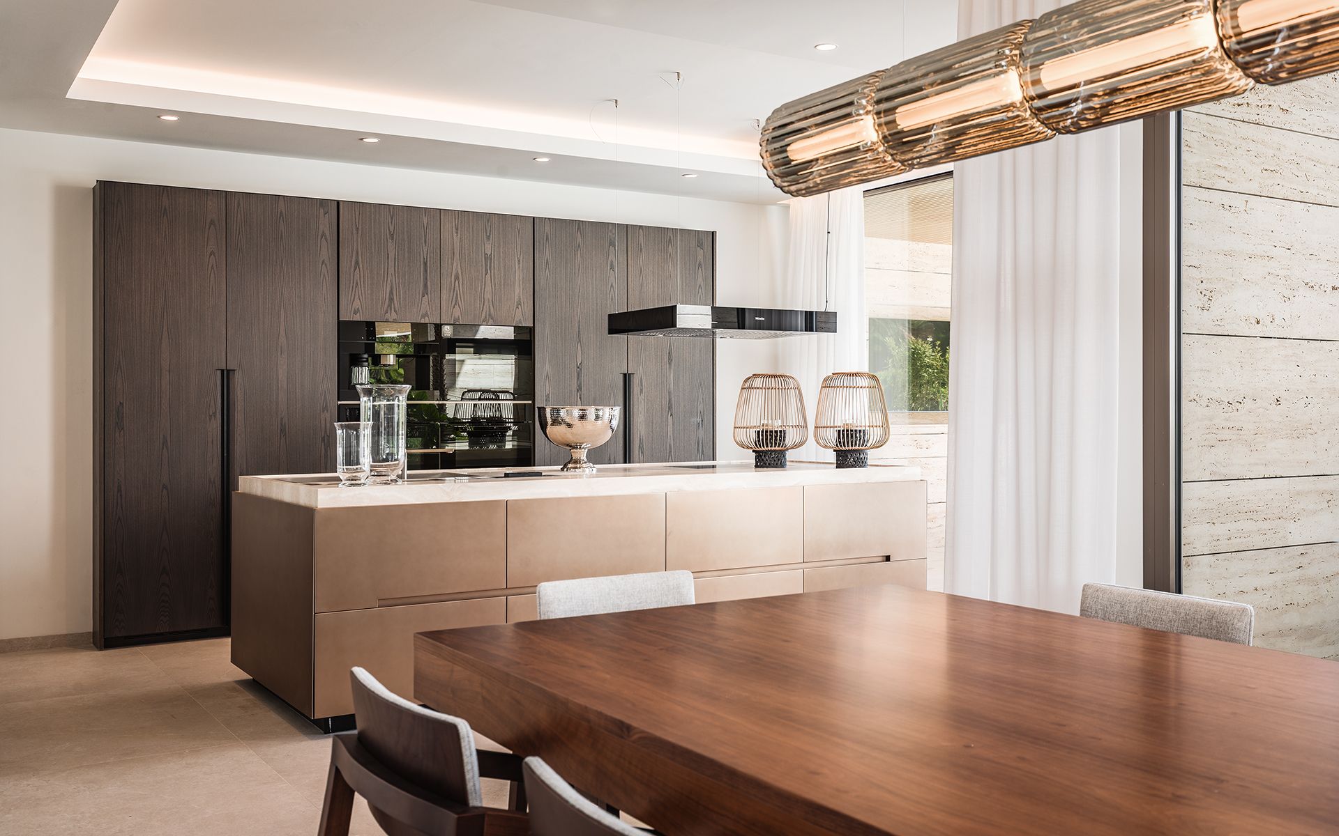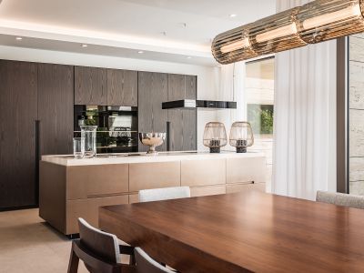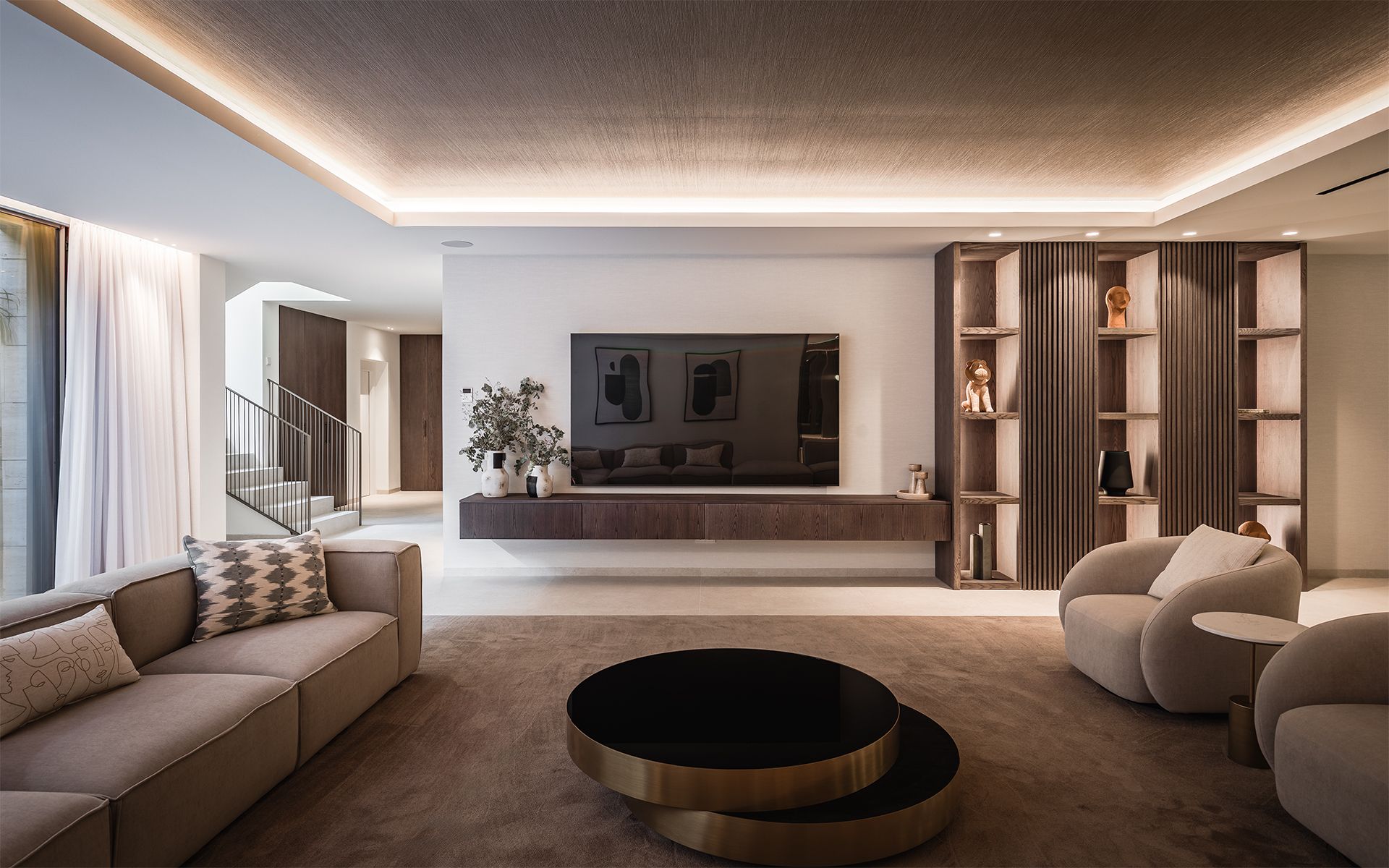 The main living level is defined by spacious, light-filled interiors finished with large-format limestone flooring and enhanced by bespoke architectural lighting. Floor-to-ceiling sliding glass doors open fully to the exterior, allowing the living and dining areas to flow naturally onto covered and open terraces. The modern designer kitchen, equipped with premium appliances and refined cabinetry, serves as both a functional workspace and a social hub, finished with elegant stone surfaces and custom carpentry that reflect the home’s understated sophistication.