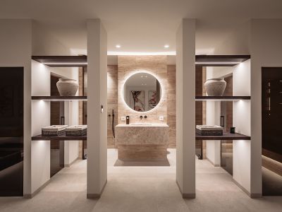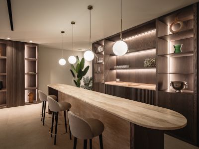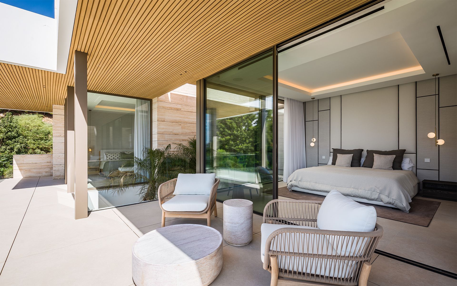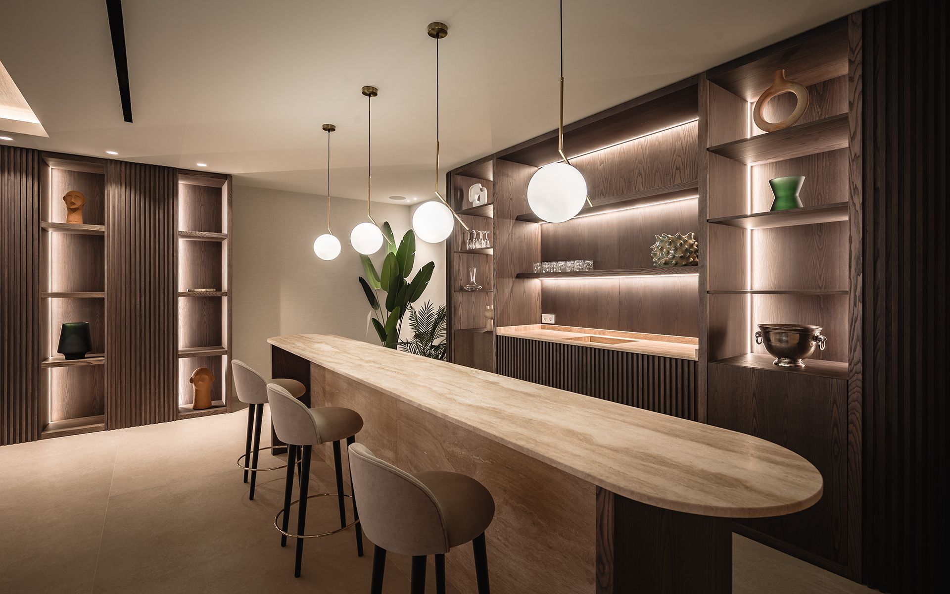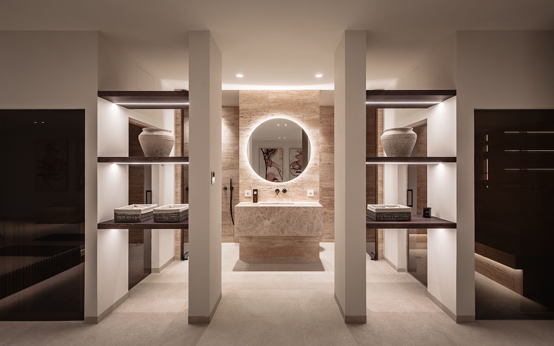 Throughout the villa, materials have been carefully selected to deliver both aesthetic impact and longevity. Natural travertine stone, tinted ash and oak wood panelling, handcrafted interior carpentry, and bespoke metalwork create a warm yet contemporary atmosphere. Bathrooms are finished to spa-level standards, featuring travertine marble wall cladding, freestanding bathtubs, walk-in rain showers, custom marble vanities, and high-quality fittings, offering a serene and luxurious experience in every suite.