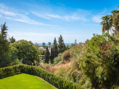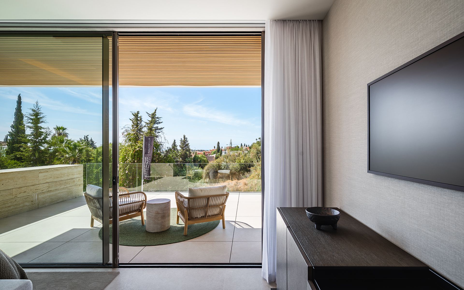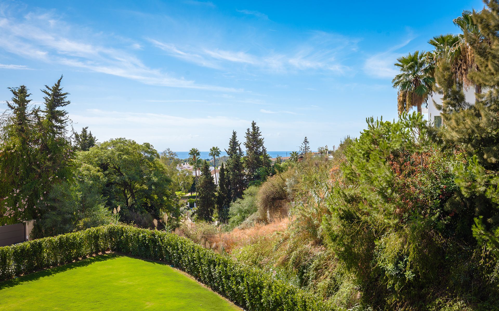 The upper floor is dedicated to elegant bedroom suites, each with private terraces, refined en-suite bathrooms, and custom-built wardrobes. The master suite stands out for its generous proportions, walk-in dressing area, luxurious bathroom with freestanding bathtub, and tranquil views over the surrounding greenery and distant Mediterranean horizon, forming a true private retreat.