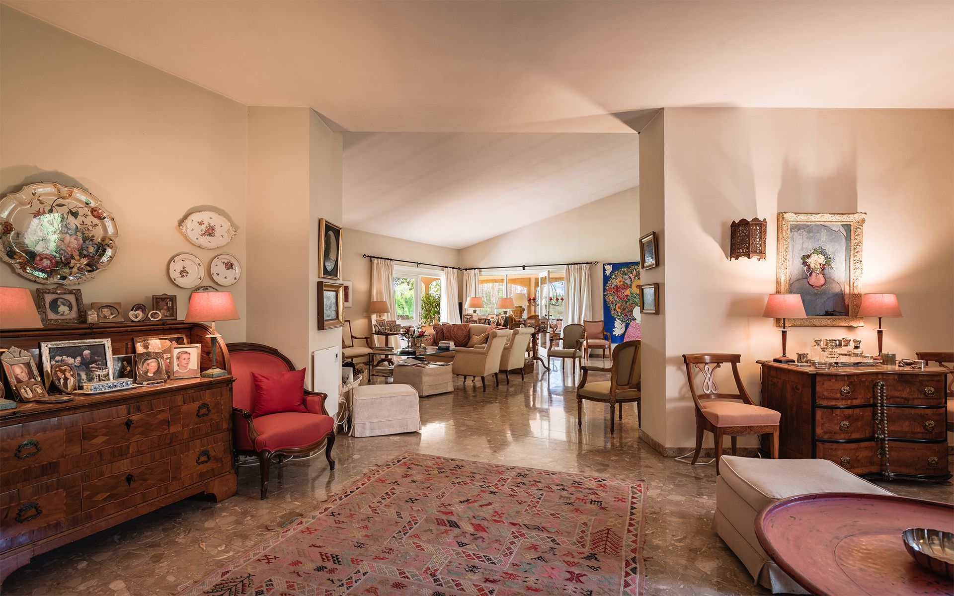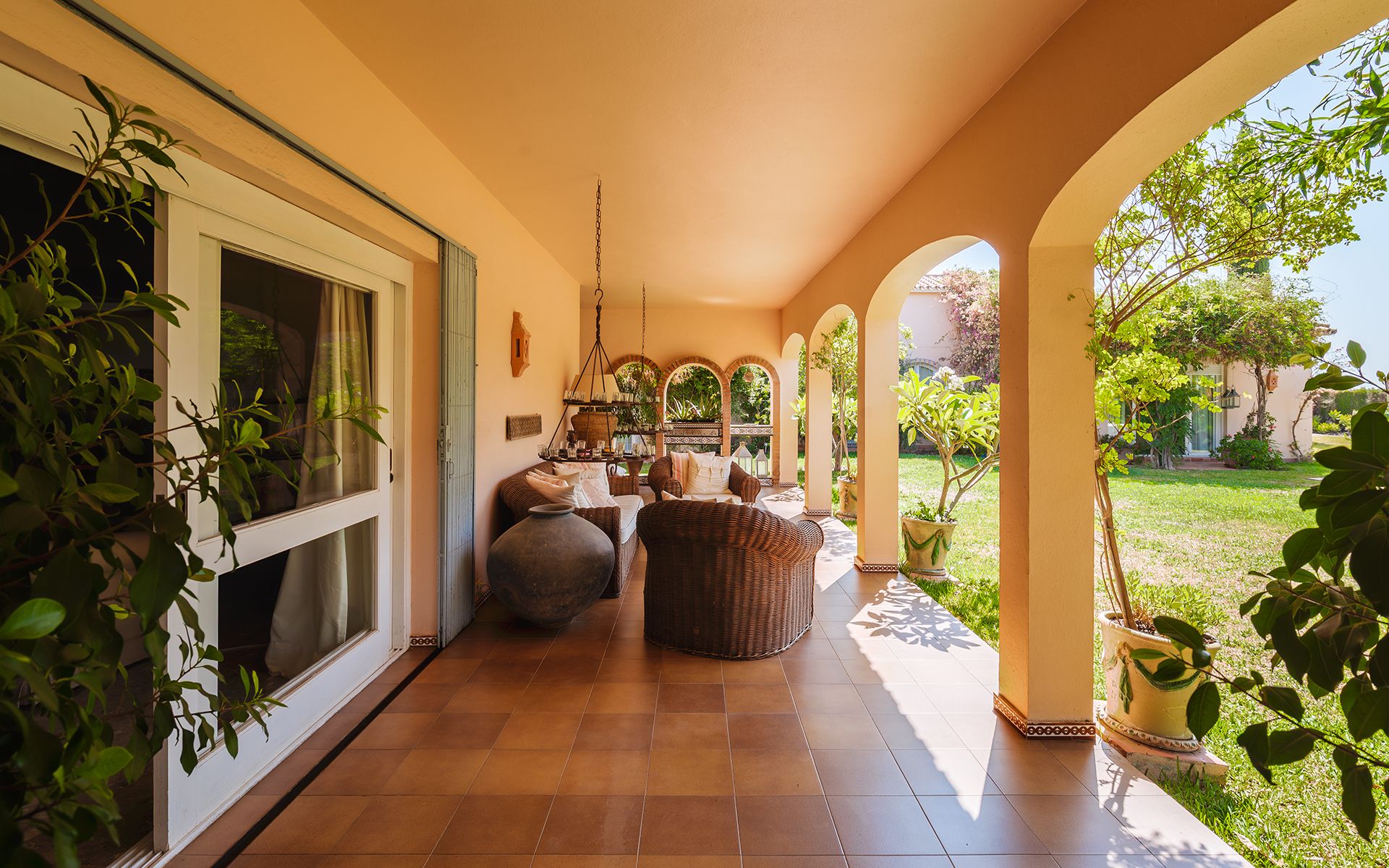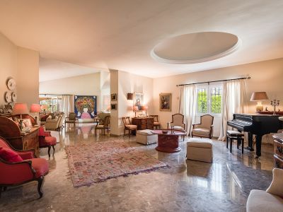 A picturesque Andalusian courtyard with a central fountain welcomes you into the home, creating a warm and inviting atmosphere from the moment you arrive. Inside, the villa opens into an expansive living area with soaring gabled ceilings, thoughtfully divided into several ambient spaces—a cozy lounge with a fireplace, a formal dining room, and a delightful music or reading nook anchored by a piano.