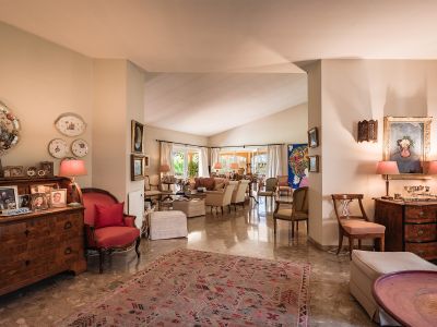 Surrounded by a meticulously landscaped garden, the property boasts a private swimming pool and an outdoor parking area—ideal for entertaining or enjoying the Mediterranean climate in total privacy. From its elevated position, the villa enjoys partial sea views and tranquility, just minutes from top-tier amenities, international schools, and golf courses.