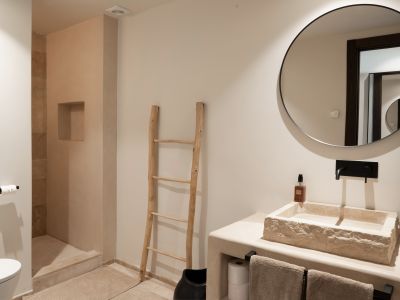The master suite occupies the entire upper floor, offering a private terrace with sun loungers, outdoor shower, a spectacular dressing room and a full bathroom with bathtub and shower.