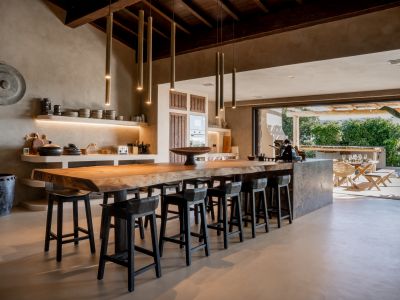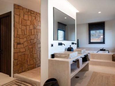 The design of the villa stands out for its unique character, with polished concrete floors throughout the house, underfloor heating in the bathrooms, extra insulation on the walls and individual air conditioning units for air conditioning, as well as ceiling fans. Sustainability is also key, with 24 solar panels that supply hot water and heat the pool.