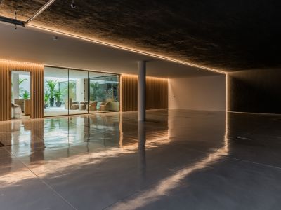The villa’s basement is a true haven for entertainment and relaxation. It includes a home cinema, where you can enjoy the latest films in style, a fully equipped bar, and a large multipurpose room for gatherings or personal fitness. A guest bedroom with its own en-suite bathroom is also located in this area, providing additional privacy for visitors. For your convenience, the basement houses laundry facilities, ample storage space, and a garage that can accommodate up to eight vehicles—ideal for car enthusiasts or large families.