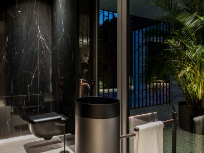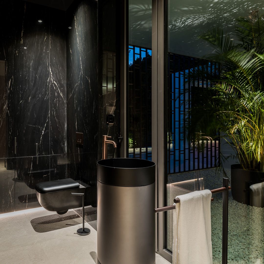 This villa features five generously sized bedrooms, each with its own luxurious en-suite bathroom and access to private terraces. Every room is designed to offer maximum comfort and privacy, with ample natural light flooding in through floor-to-ceiling windows. The master suite is a true sanctuary, complete with a spacious dressing room that adds an extra layer of sophistication to this already elegant home.