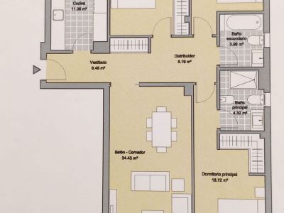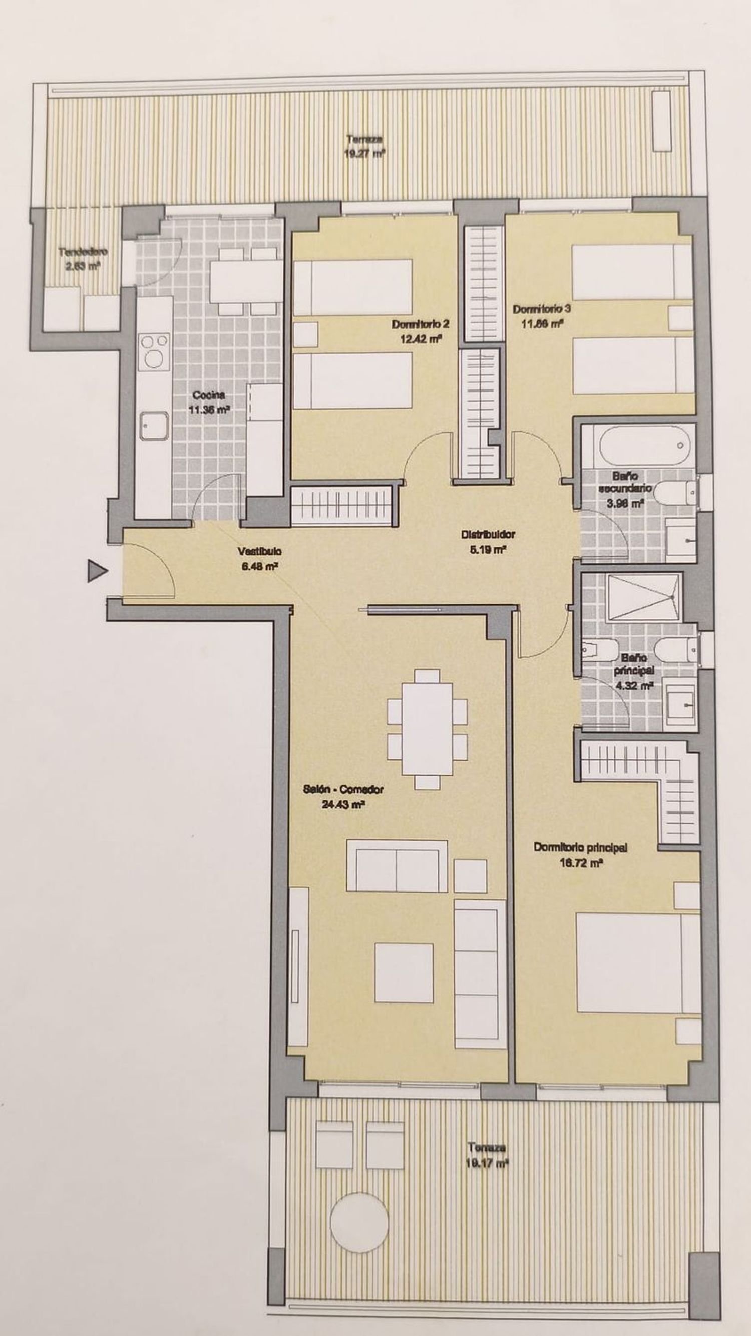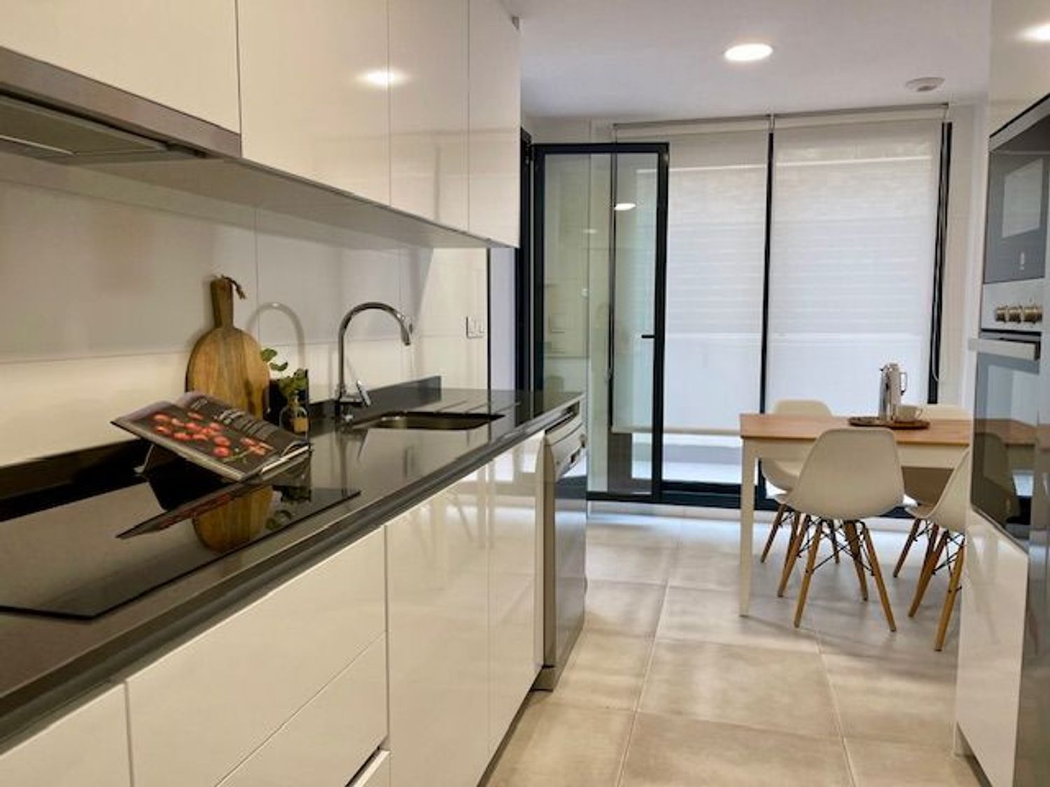 The home offers 99,37 m2 of usable space and two terraces 38,44 m2, distributed across a spacious living room, a fully equipped kitchen, 3 bedrooms, 2 full bathrooms, a large main terrace with open views, and an additional laundry area with terrace. It also comes equipped with a home automation system, as well as a large parking space and storage room.