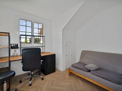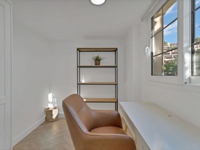 The house is distributed across two levels. On the main floor, a brand new open plan kitchen with top of the range appliances connects seamlessly to the living area with a travertine marble fireplace and dining space. Large glass doors open onto a sunny terrace with a barbecue area and a private plunge pool, ideal for outdoor entertaining. This level also offers a spacious en suite bedroom and a guest powder room.