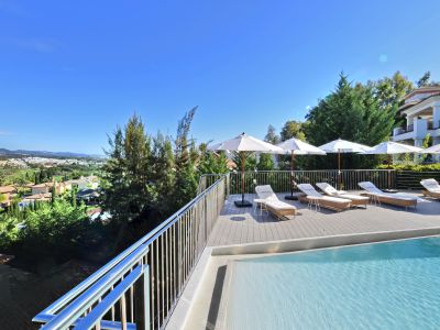 Located in the heart of the prestigious Golf Valley of Nueva Andalucía, this exceptional villa combines modern luxury with panoramic views of the Mediterranean Sea and the iconic La Concha Mountain. Facing southeast, the villa stands out for its brightness, comfort, and contemporary design, seamlessly fused with exceptional elegance. Spread across four floors, the main level features an impressive double-height entrance hall that leads into a spacious living and dining area with large windows framing the surrounding landscape. The open-plan kitchen, fully equipped with top-of-the-line appliances, blends functionality with modern design. This level also includes a guest toilet and a laundry area. From the living room, there is direct access to the large main terrace, where you’ll find a spectacular heated saltwater infinity pool, an outdoor dining area, and a cozy chill-out space perfect for relaxing and enjoying the surroundings.The lower level hosts a generous leisure and wellness area that includes a cinema and games room with a pool table, as well as five bedrooms with natural light, two of which feature en-suite bathrooms. This floor also offers a practical storage room. The first floor accommodates two main bedrooms with en-suite bathrooms and private terraces, each with direct access to an elegant lounge-bar that creates an intimate and sophisticated atmosphere ideal for unwinding and enjoying peaceful moments. Finally, the top floor boasts an impressive rooftop solarium with a luxury jacuzzi for eight people, a bar area, and multiple chill-out zones offering breathtaking 360° panoramic views over Nueva Andalucía, the Golf Valley, and the coastline. The property is equipped with every modern comfort: underfloor heating throughout, centralized air conditioning, a wireless sound system, LED lighting, and an automatic irrigation system in the gardens. At the main entrance, there is private parking for up to four vehicles. A truly unique villa that combines elegance, technology, and comfort in one of Marbella’s most exclusive areas just minutes away from the best golf courses, fine dining restaurants, and the incomparable lifestyle of Puerto Banús.