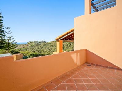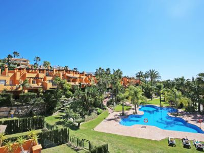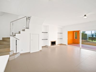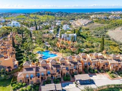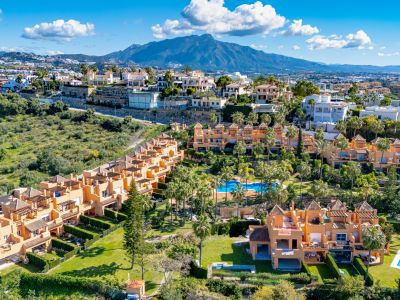 Superb three bedroom, south facing townhouse in Paraiso Bellevue, in El Paraiso on the New Golden Mile, only a short drive to the beach and all the leisure amenities. This gated complex has fantastically maintained gardens and a large lagoon style communal swimming pool. On the main level there is the living-dining area with a fireplace and patio doors leading out to the terrace and private garden; open plan kitchen together with a breakfast bar and a guest toilet. On the upper level is the master suite with an access to the private terrace with views to the pool and sea; and two guest bedrooms sharing a bathroom. There is also a spacious solarium offering sea and mountain views. Other features include marble floors, fitted wardrobes, hot and cold air conditioning and private communal parking.