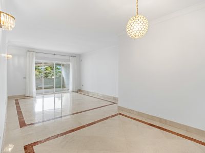 Situated on Marbella’s Golden Mile, this elegant two-bedroom beachfront apartment is located in the prestigious Jardin del Mediterráneo community, just a two-minute walk from the beach with all amenities within easy walking distance. The property features a bright and welcoming entrance that opens into a spacious living and dining area with direct access to a private terrace, ideal for outdoor dining. The apartment offers a fully equipped kitchen with a separate utility room, a generous master bedroom with en-suite bathroom, a guest bedroom, an additional bathroom, and a guest toilet. Further features include air conditioning, electric blinds, one parking space, a storage room, and access to beautiful communal gardens, a large communal swimming pool, and an additional smaller pool.