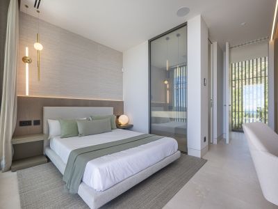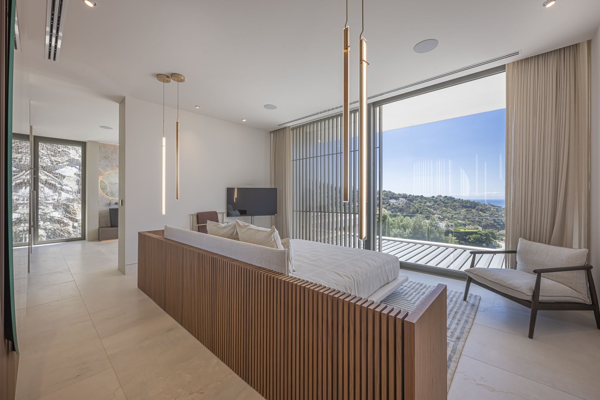 The master bedroom is a true oasis of relaxation, with large windows that offer stunning views of the mountains and sea.