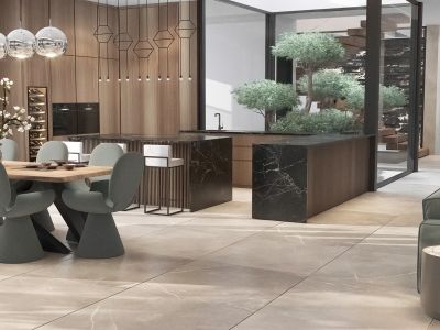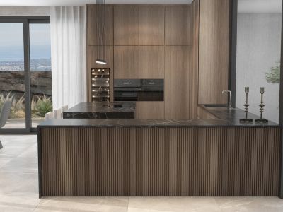 The interior design of the villa consists of two glass cubes, allowing for additional open space where you will find a beautiful olive tree and can enjoy smoking shisha. Thanks to floor-to-ceiling windows, the villa is very bright and filled with natural light. These windows not only flood the interior with sunshine but also feature sun protection, ensuring a comfortable and ambient atmosphere year-round.