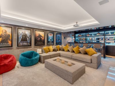 The villa’s interior is meticulously finished, featuring marble floors with Under Floor heating all over the house, a grand living room with a fireplace, and a separate dining room. The fully fitted kitchen is complemented by a utility room and a kitchenette, ideal for culinary enthusiasts. Entertainment is at the heart of this home, with a dedicated cinema room, games room, Dolby Stereo Surround system, and several terraces—both covered and uncovered—providing mountain, sea, garden, and pool views. Additional spaces include an office room and ample storage, ensuring practicality alongside luxury.