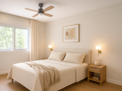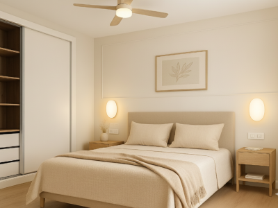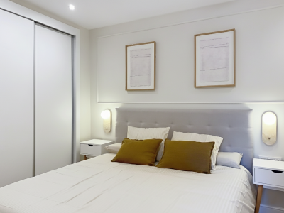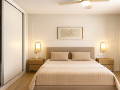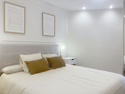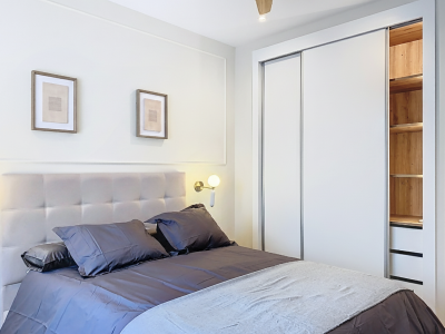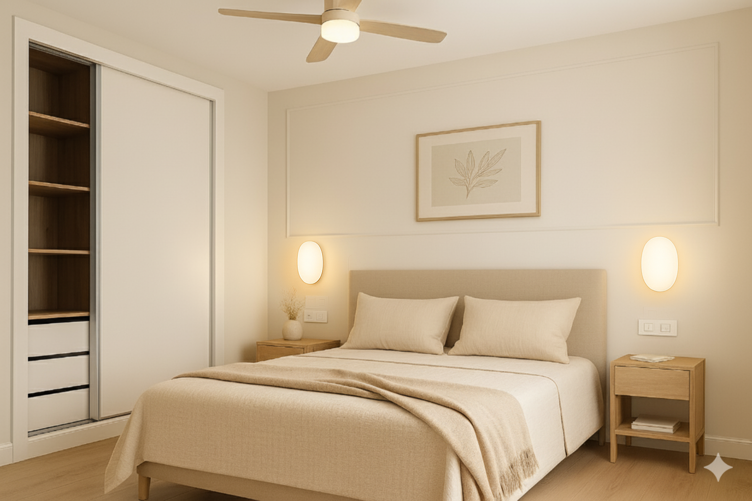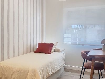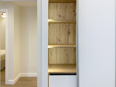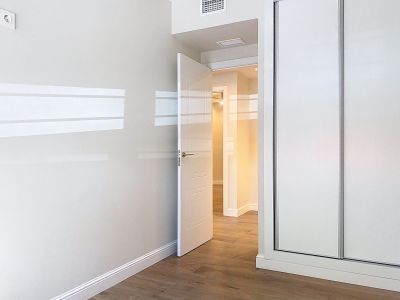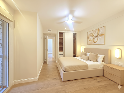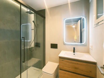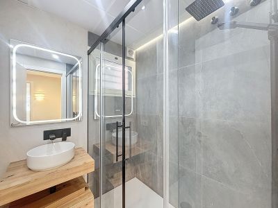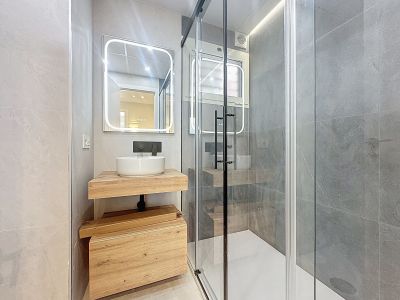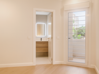 The apartment features three spacious bedrooms, all with new, lined, and illuminated built-in wardrobes, as well as ceiling fans and a powerful air conditioning system (8,000 frigories) that ensures maximum comfort throughout the year. The master bedroom has an en-suite bathroom with a modern shower and access to a balcony overlooking the interior of the complex, while the other two bedrooms—one currently used as a dressing room—share a second full bathroom. Both bathrooms stand out for their complete renovation with top-quality finishes, each featuring exterior windows that provide perfect ventilation. They include sliding glass shower screens designed to offer greater comfort and elegance.
