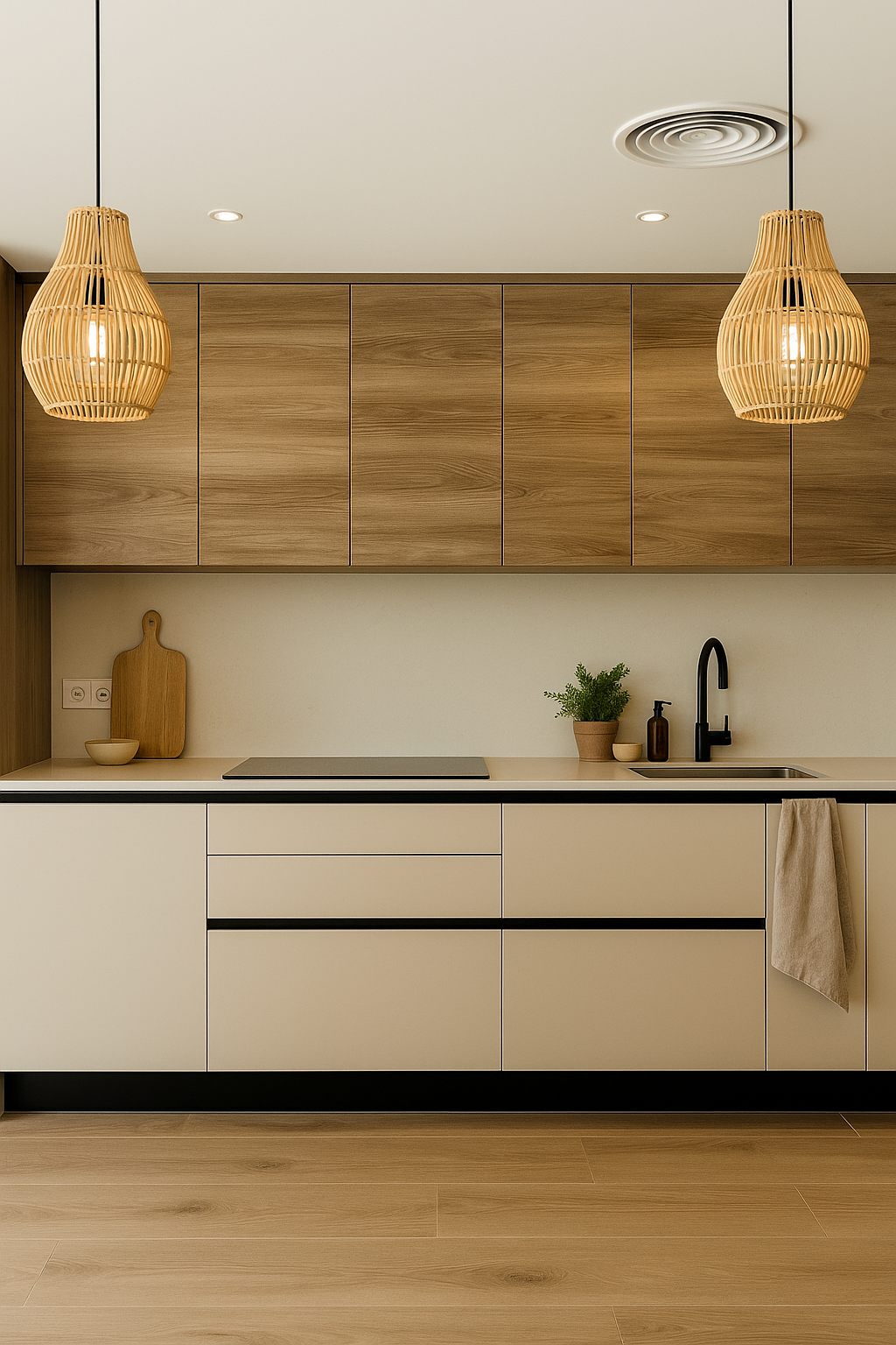 The interior layout includes a spacious and bright living room with direct access to a cozy private terrace of 7 m² with open views. The designer kitchen, fully equipped and with integrated laundry area, offers a practical and elegant space, connected to the terrace and open to the living room through a large peninsula.