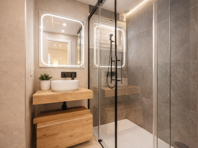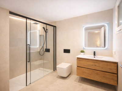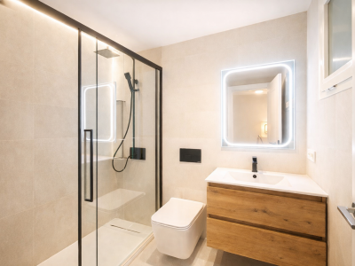 The apartment features three spacious bedrooms, all with new, lined, and illuminated built-in wardrobes, as well as ceiling fans and a powerful air conditioning system (8,000 frigories) that ensures maximum comfort throughout the year. The master bedroom has an en-suite bathroom with a modern shower and access to a balcony overlooking the interior of the complex, while the other two bedrooms—one currently used as a dressing room—share a second full bathroom. Both bathrooms stand out for their complete renovation with top-quality finishes, each featuring exterior windows that provide perfect ventilation. They include sliding glass shower screens designed to offer greater comfort and elegance.