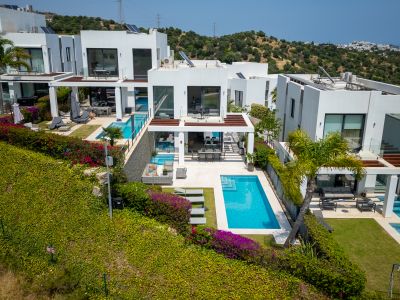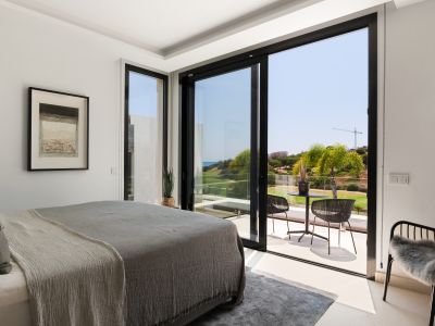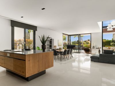 This stunning semi-detached villa offers panoramic views of the Mediterranean Sea and the lush Cabopino Golf Course, set within the exclusive gated community of Green Hill Marbella. Surrounded by rolling Andalusian hills, the home blends sleek modern design with natural surroundings, creating a private oasis of luxury and tranquility.