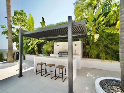 The thoughtfully designed home features five spacious bedrooms and five bathrooms, ensuring comfort and privacy for family and guests alike. The outdoor living experience is truly exceptional, with a private garden showcasing a sparkling pool, fully equipped outdoor kitchen, and a dedicated gym area – perfect for embracing the active Mediterranean lifestyle. The property includes a generous two-car garage, providing secure parking and additional storage space.