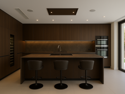 Inside, the home exudes contemporary sophistication. The open-plan living area is enhanced by ambient ceiling lighting and a soft neutral color palette, creating a warm and welcoming atmosphere. The dining area flows seamlessly into the kitchen and social zones, making it perfectly suited for both everyday living and special occasions. A high-end indoor/outdoor sound system ensures effortless entertainment throughout.