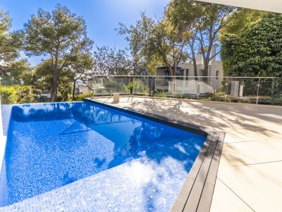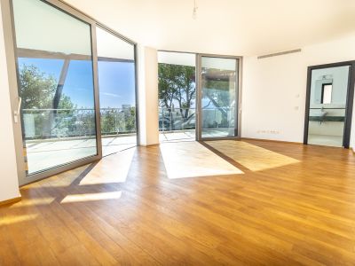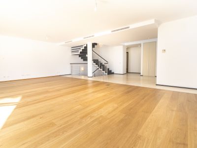The property offers 4 en-suite bedrooms plus a staff bedroom, spacious terraces, and a large solarium with a private pool and lounge areas. Inside, the floors are connected by a lift. The bright and spacious living room, designer kitchen, and open-plan layout stand out, reflecting a contemporary and sophisticated style.