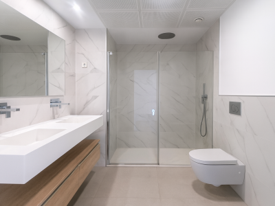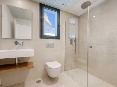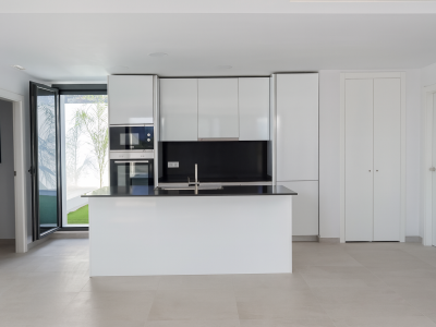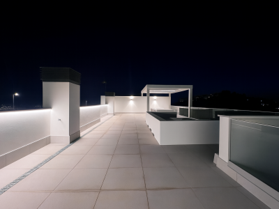 The main floor features a spacious open-plan living and dining area connected to a sleek modern kitchen with premium appliances and ambient LED lighting. Floor-to-ceiling windows open onto a stunning 97 m² terrace with a brand-new private pool — the perfect setting for relaxing, entertaining, and enjoying the Costa del Sol sunshine.