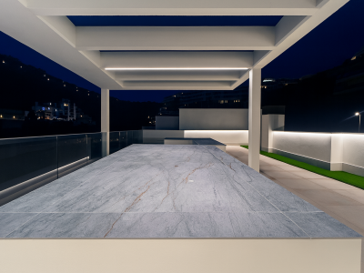 The upper level boasts a second 127 m² terrace with panoramic views across La Quinta’s rolling hills, complete with an outdoor dining area and elegant lounge space. Subtle LED lighting enhances the atmosphere, creating an ideal spot for evening gatherings.