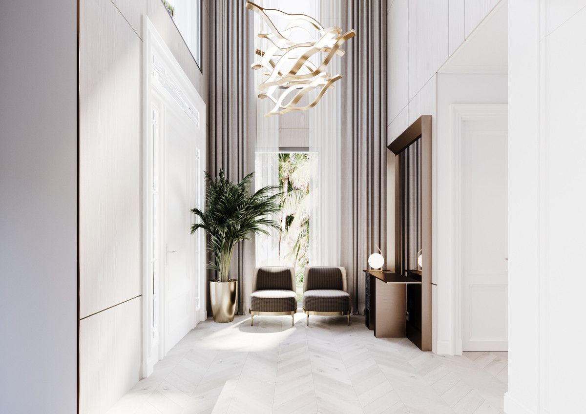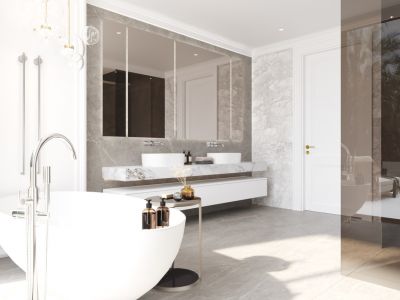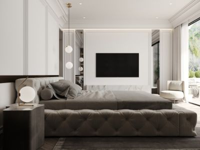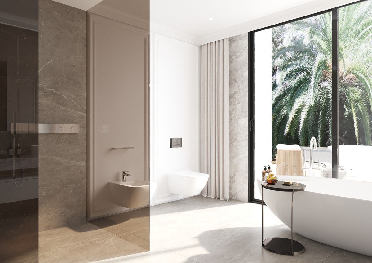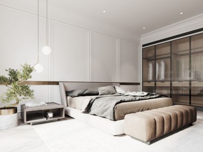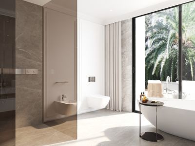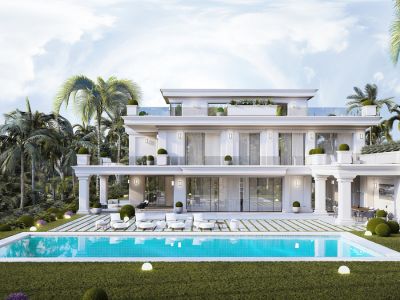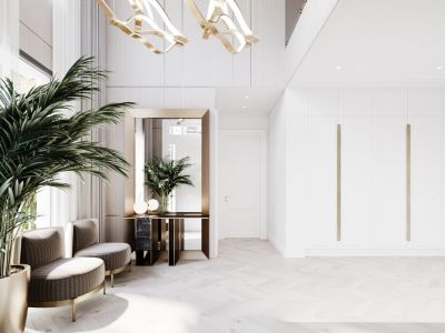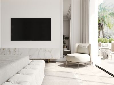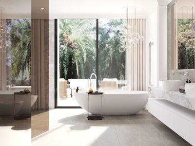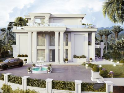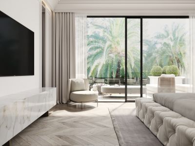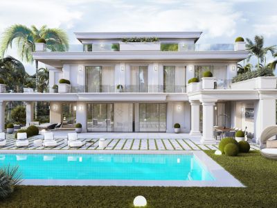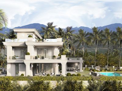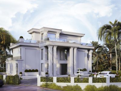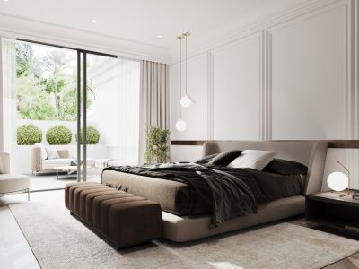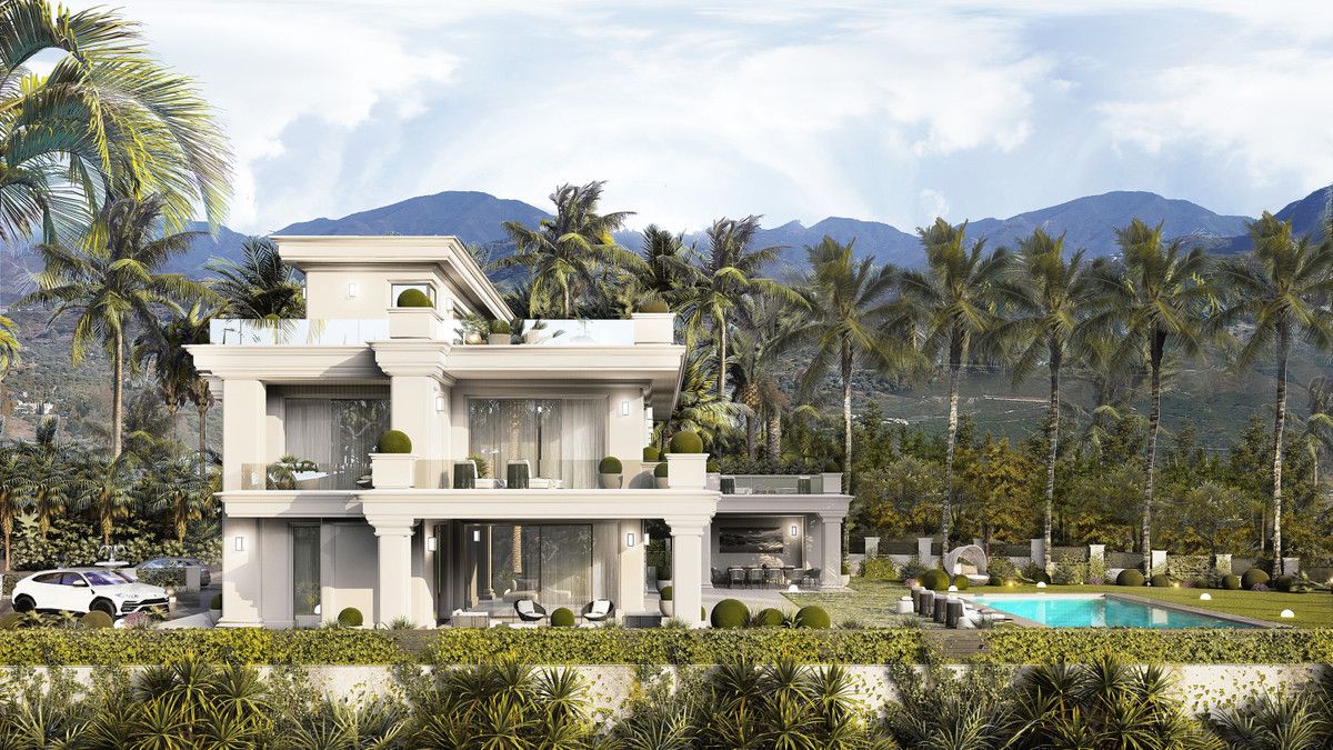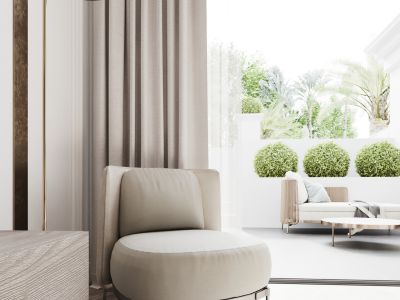 This sophisticated set of only 4 independent villas is located in a prestigious urbanization on the Golden Mile – Lomas de Marbella Club. Known as one of the most popular luxury residential areas in Marbella, it is located opposite the Roman Bridge and close to the Royal Mosque. These villas are characterized by their beauty, elegance and comfort. All facing south and with a classic and modern appearance, with superior qualities throughout. Each villa has an elevated position which, together with its orientation, offers beautiful views of both the Mediterranean Sea and La Concha Mountain. The villa is well proportioned in layout, spread over 3 levels and a solarium to create an exquisitely tasteful 5 bedroom residence with multiple entertaining areas. Access to the villa is impressive thanks to its double height ceiling and large contemporary pillars. The heated saltwater pool has a covered and an open terrace and an elegant hammock area that invites you to enjoy the beautiful Marbella climate with family and friends throughout the year. Upstairs the master bedroom offers privileged access to the large terrace with a spectacular view of the pool and the sea below. In addition to the entertaining areas in the garden, the spacious upper solarium has enough space for an outdoor gym with glass curtains, as well as more fabulous indoor and outdoor lounge areas.